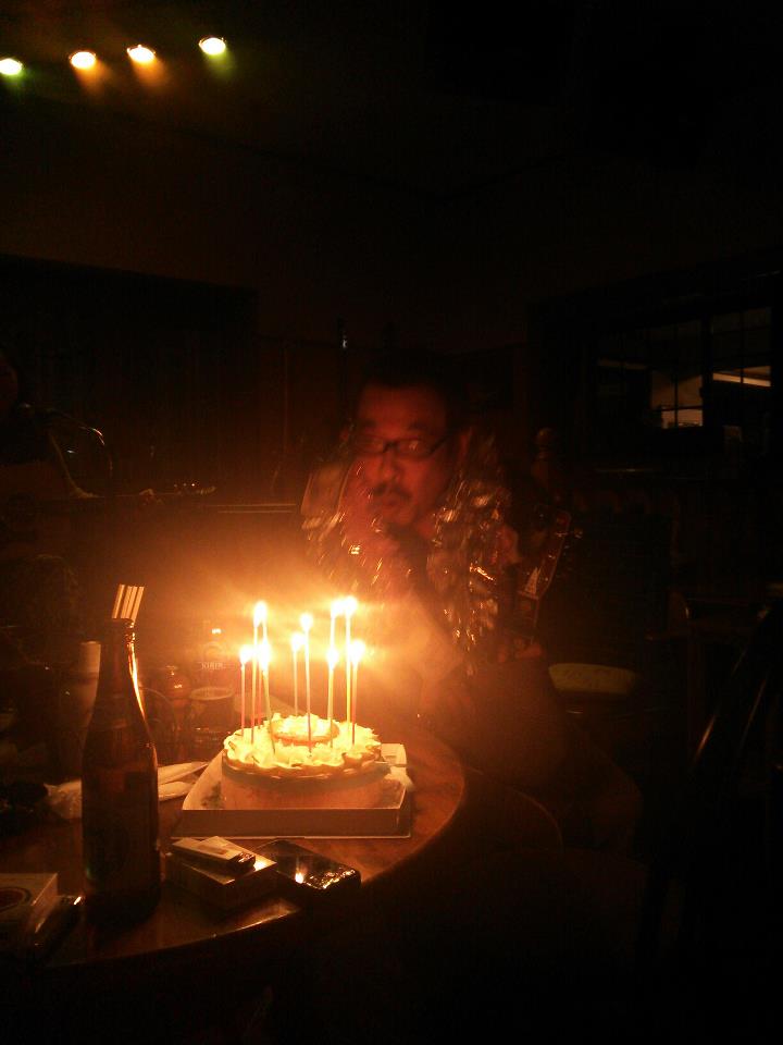さすがにこの歳になると、歳をとること自体はけっしてうれしいことではないのだけれど、それでも一年に一度必ずやってくるのが誕生日。私にとって昨日がその日。還暦の足音が聞こえ始める57歳になった。そんな昨日は偶然にも、数ヶ月に一度開催されるクックハウス椿さんの「フォークの日」であり、いつもどおりギターを持って参じた。出演順は基本的に抽選で決まるのだが、同行した事務所の姐さんが「早めに歌って飲みたい」とのことで出演順の変更をした。そのときはよくありがちな話と思って気にもとめていなかったんだけど。サプライズは、その姐さんのステージの3曲目。とつぜん“Happy Birthday”が歌われ始めて。誕生日ケーキが運ばれてきて、壱萬円札がいっぱいついたレイを首にかけられて。ただし、この壱萬円札はオモチャで、実際にオカネとして使うことはできない。本音を言えば、たくさんのオモチャの壱萬円札よりも、1枚の本物の壱萬円札のほうが良かったけれど、それは贅沢というもの。いやぁ、それにしてもまったく予期していなかっただけに、この演出には超ビックリ。姐さんの出演順変更の理由も納得。聞けばこのサプライズのために前日から密かに準備が進められていたとか。冒頭にも述べたように、この歳になると誕生日そのものにはたいした感激はないけれど、みんながこうして祝ってくれる…その気持ちがとってもうれしい。昨日は57歳の誕生日。おかげさまで思い出深い良い日になった。みんなみんな本当にありがとう。