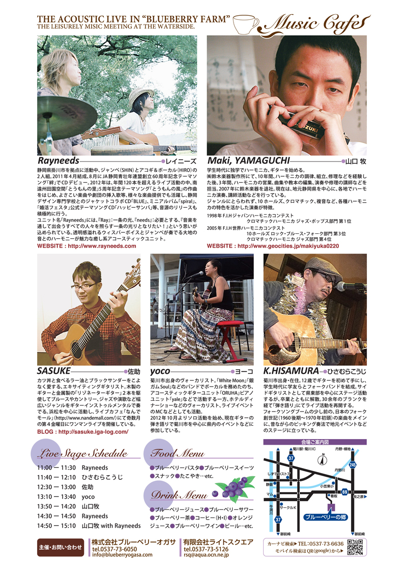 ライブのお知らせである。菊川市にある観光農園「ブルーベリーの郷」において、来る5月3日(祝)午前11時〜午後3時30分、私を除き錚々たるメンバーでのライブが開催される。主催は株式会社ブルーベリーオガサさんと弊社による共催。ごまんさ池のほとりの緑ゆたかな自然にいだかれて、ブルーベリーの美味を食しつつ休日のひとときを音楽とともに楽しもう…という主旨で、タイトルは"Music Cafe"。のんびりとくつろげる、そんなライブにしたいと思っている。佐助くんのソロギターによる、瀟洒なインストルメンタルサウンド。個人的には、ふだん耳にすることが少ないリゾネーターによるスライドギターがお薦め。山口牧先生のハモニカも聴きごたえタップリ。さまざまなハモニカを駆使して、聴く者を魅了してくれる。出演者の中で紅一点。yocoこと事務所の姐さんは、これまでバンドやユニットのヴォーカリストとしてその美声を披露してきたが、今回はアコギを抱えて弾き語りでステージを彩ってくれる。そして今回のメインゲストは、な、な、なんと、あのRayneeds。ギター&ヴォーカルのHIROくん。ジャンベのSHINくん。二人が醸し出す美しいサウンドは、ブルーベリー農園のロケーションにジャストフィット間違いなし。貴重なハモニカの牧先生とのコラボステージもあって、これでワンドリンク付き¥1,000は超お得。ぜひぜひ、お越しあれ。ただし駐車場には限りがあるので、できるかぎり乗り合わせにて。よろしく!